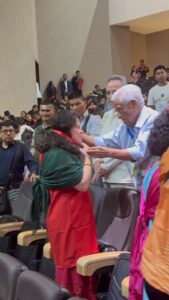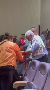 Durante la premiación el secretario general del Movimiento Antorchista Nacional el Ing. Aquiles Córdova Morán felicitó a las hermanas Pili y Carmen por ser participantes antiguas de las Espartaqueadas.
