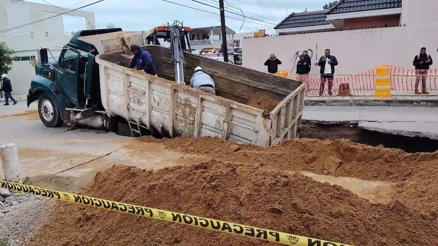 Tampico, Tam.- Un camión de carga tipo tolva, que transportaba varias toneladas de arena, cayó en un enorme socavón cuando…