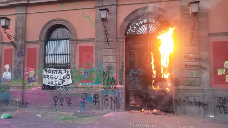 #SanLuisPotosí //Durante protesta de #8M en #SLP, incendian la puerta principal del Edificio Central de la UASLP